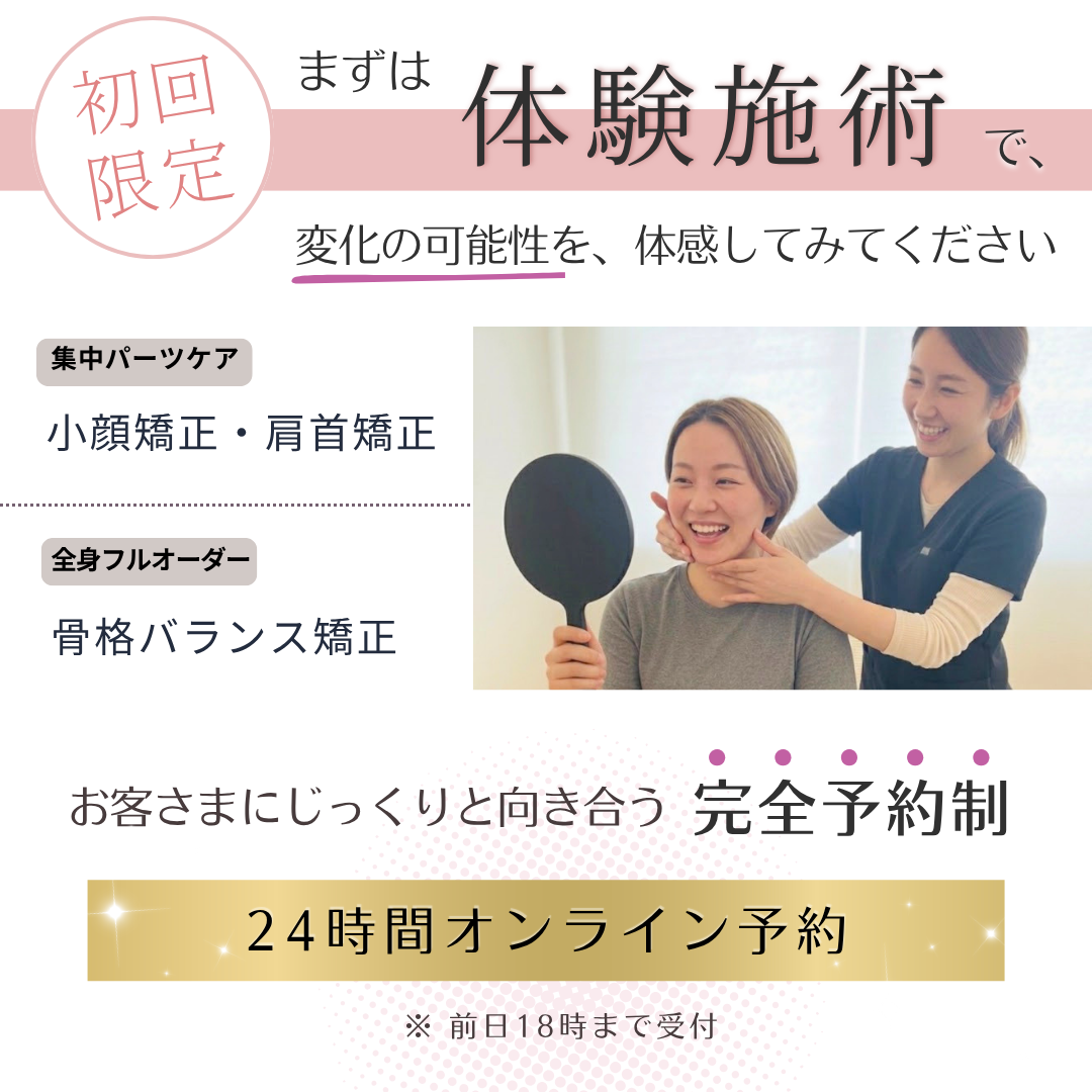 お顔の悩み、首肩こり、自律神経の乱れ、不良姿勢などのお悩みを根本改善したい方に